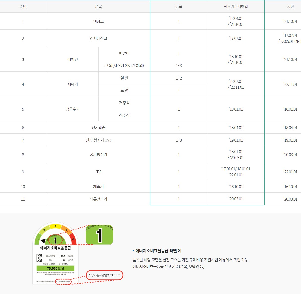 반드시 에너지소비효율등급 라벨사진의 "등급"과"적용기준 시행일" 확인