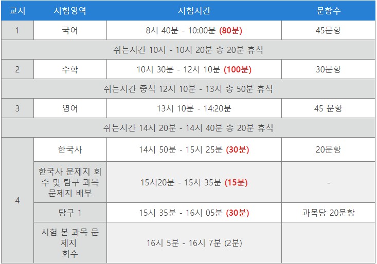 11월 | 11월16일(목요일) | 국어,사회,영어,한국사,사회탐구,과학탐구 직업탐구, 제2 외국어 및 한문 |