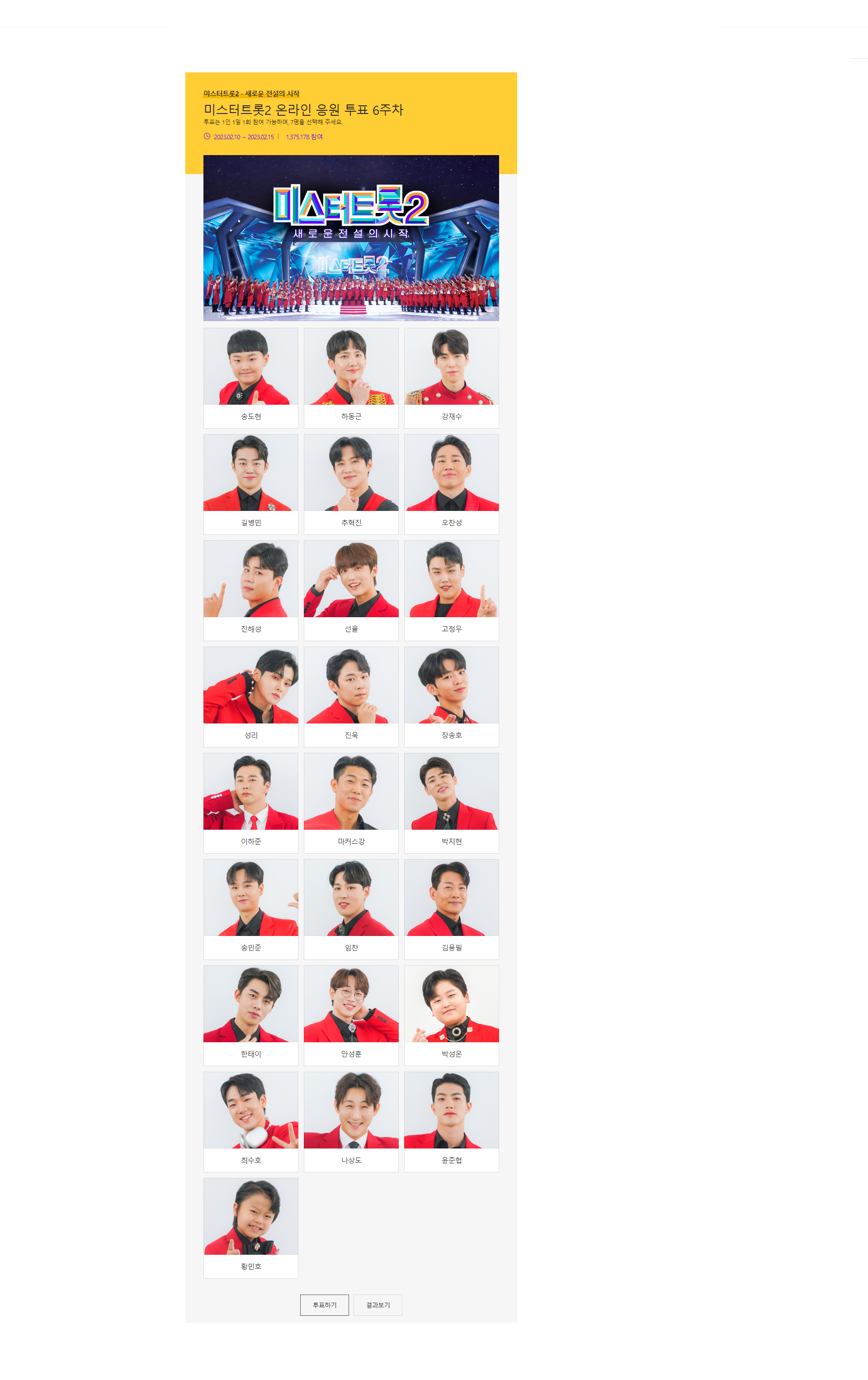 회가 거듭될수록 더욱더 재미있어지는 "미스터트롯 2" 여러분들의 많은 관심으로 "제2의 임영웅"이 탄생될 때까지 지금 투표하세요.