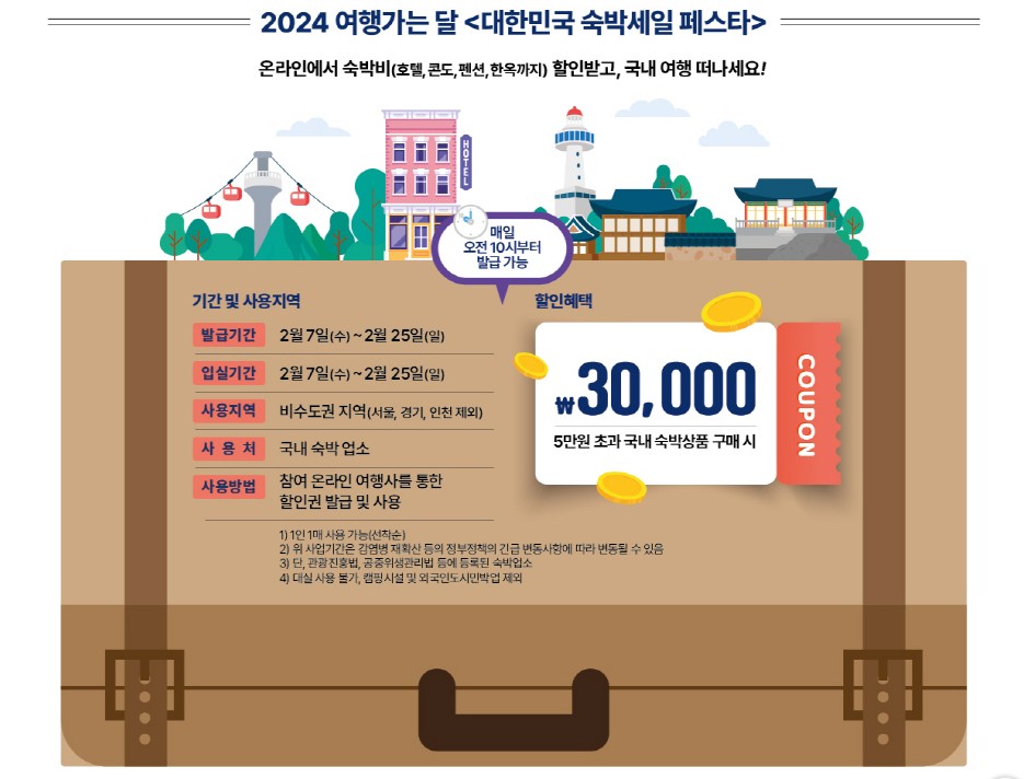 숙박 할인 쿠폰은 2024년 2월 7일 오전 10시부터 야놀자, 여기 어때, 지마켓을 총 1인 1매 발급받을 수 있습니다.