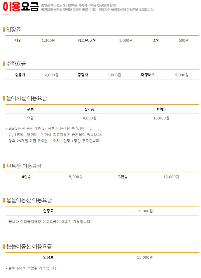 이용요금:입장료, 주차요금, 놀이시설 요금입니다.