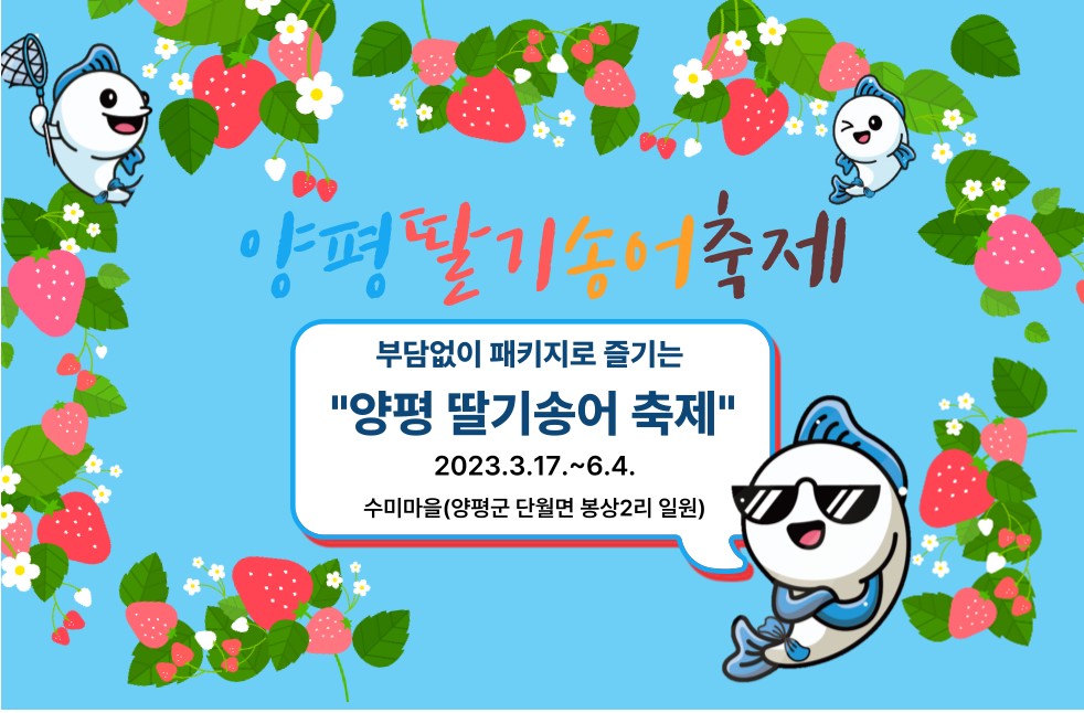 양평은 대한민국에서 맑은 물로 유명한 곳입니다. 그곳에서도 수미마을은 물과 쌀과 365일 축제로 유명한 곳으로 2023년 대한민국 농촌마을대상에서 대통령상을 수상하고 각종 매스컴에 소개된 유명한 곳입니다. 양평의 맑은 물과 딸기의 우수성을 널리 알리고 농촌관광의 산지인 수미마을을 널리 알리고자 봄을 맞이해서 "딸기송어축제"를 개최하였고, 대한민국의 봄을 대표하는 행사로 자리매김해 나가고 있습니다. "딸기송어축제"는 365일 축제로 유명한 수미마을에서 122일 동안 개최되며, 수미네 딸기체험과 송어와 놀자(송어사냥)을 테마로 한 행사로 본인 기호에 맞는 프로그램을 선택하여 즐길 수 있어 4월 먹거리 축제로 추천합니다.